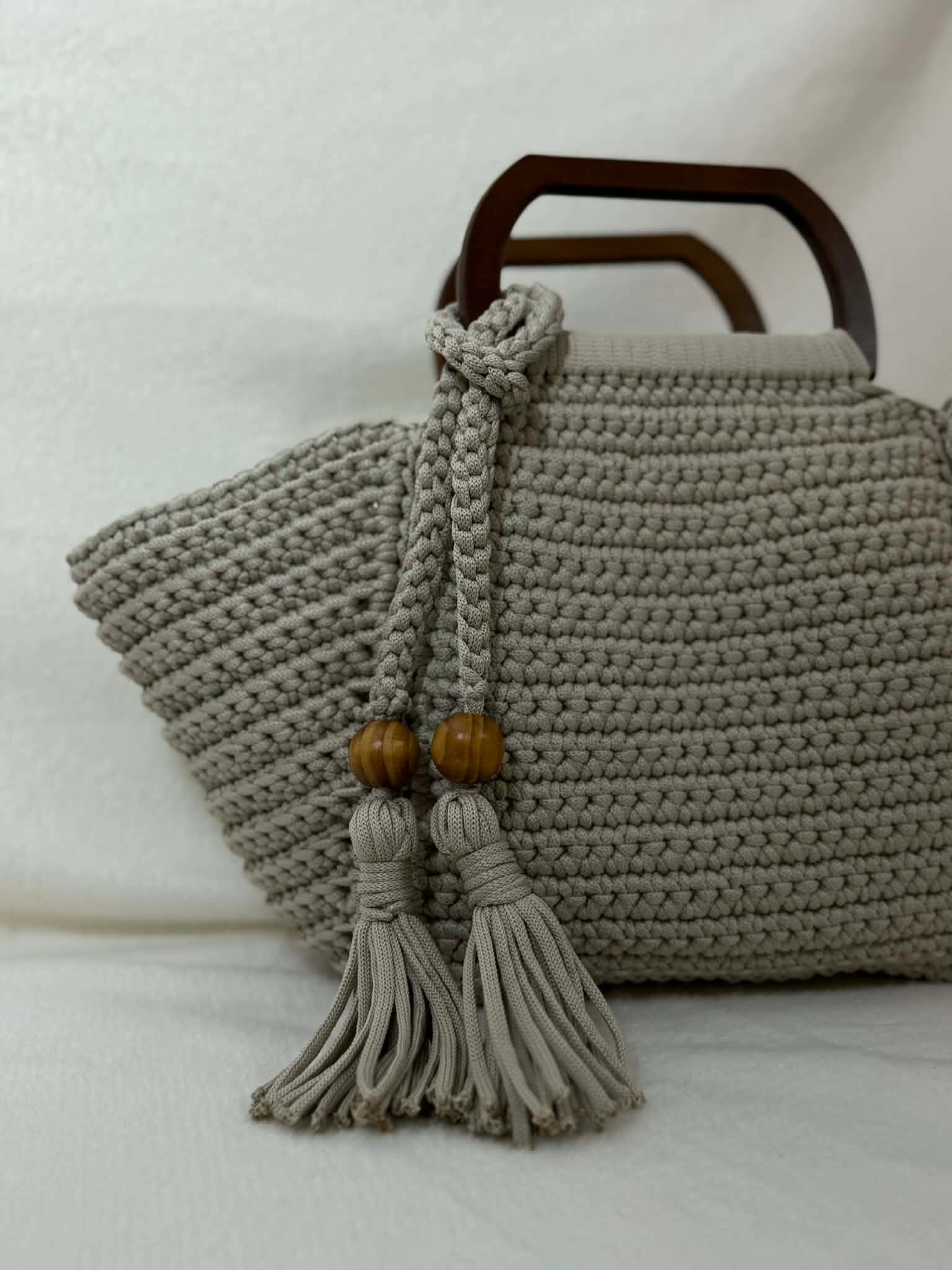 Ceker z lesenimi ročaji in dodatkom unikatnega cofka, ki doda torbici eleganten videz.